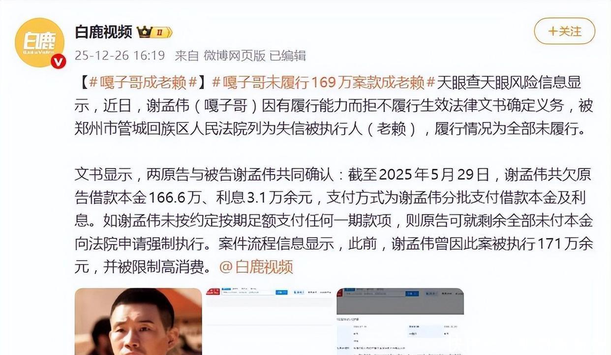 谢孟伟,就是那个演嘎子的,大家肯定都听过他穿警服搞直播那事儿,结果被关了7天,好几个直播号也被永久封了,想用小号再露面都没门儿。到了12月的时候,他竟被法院列为了被执行对象,欠款总额已超2200万,可他非但没还钱,还偷偷转移了财产,压根不想还钱。